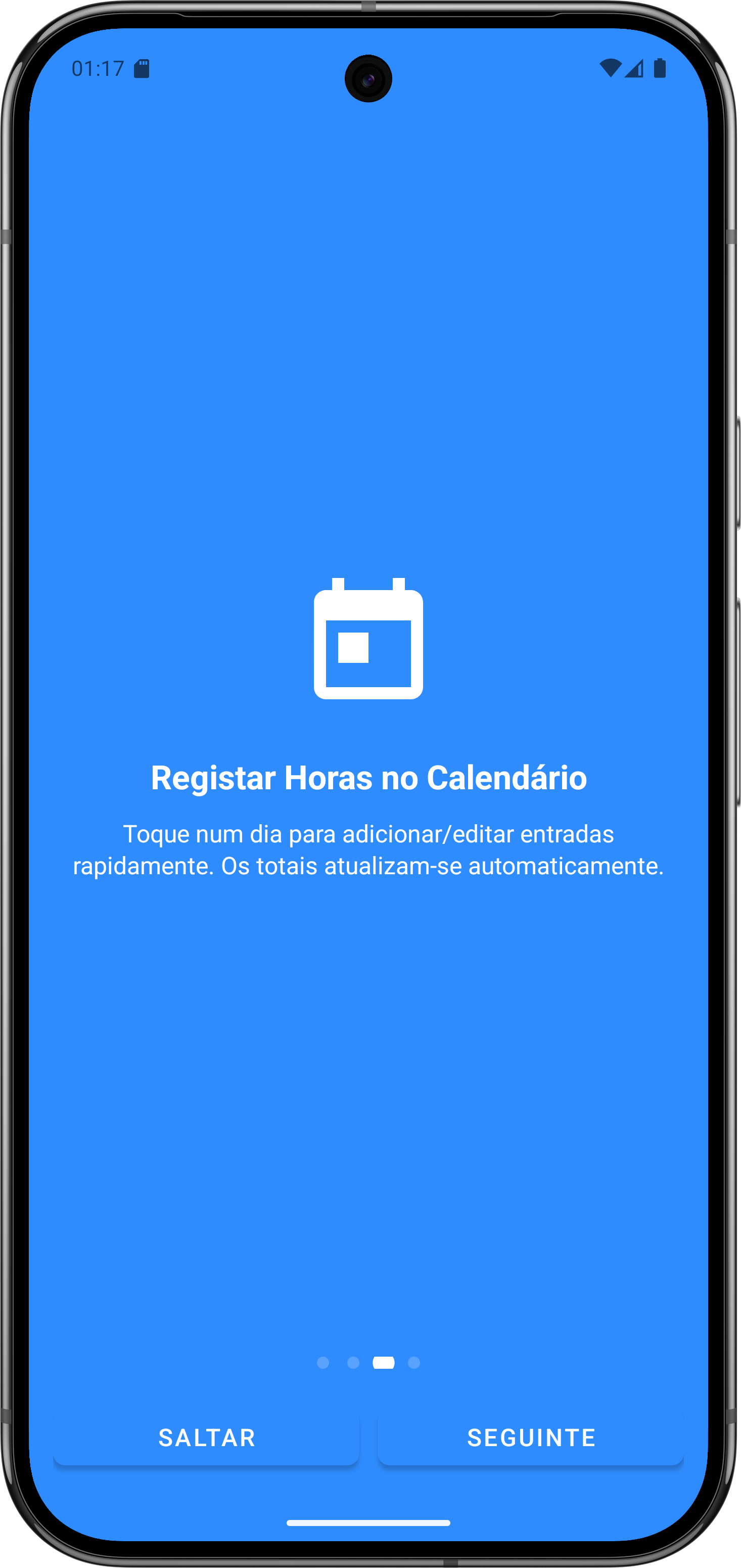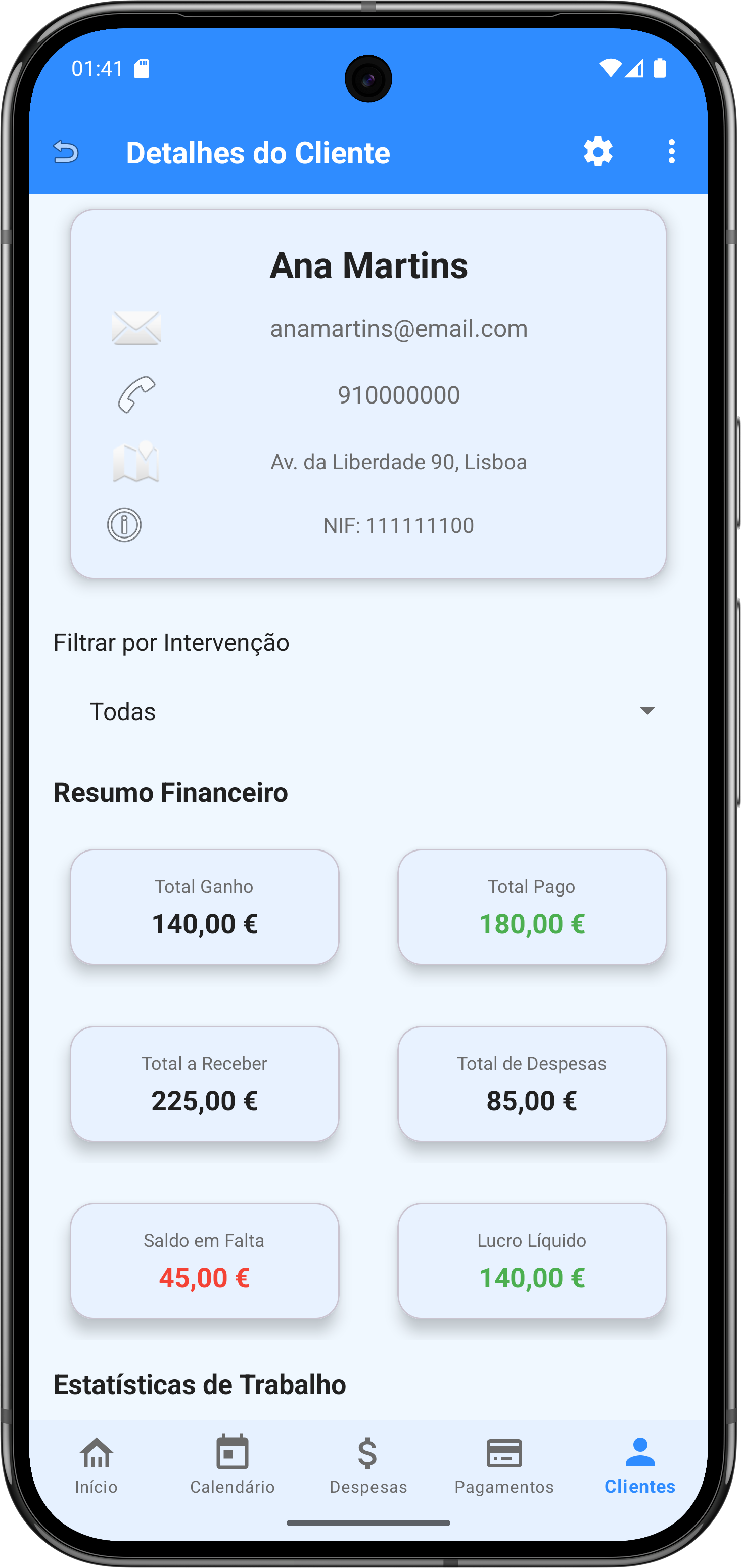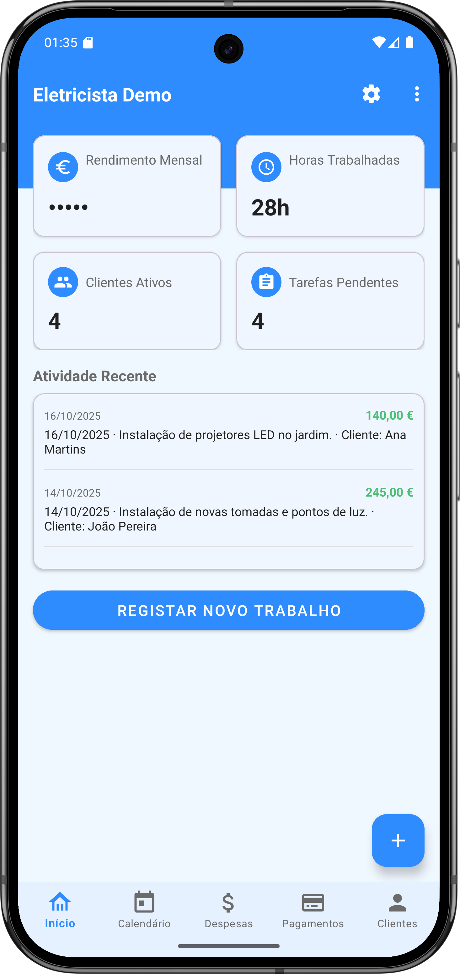 Ecrã Home da TaskChrono com cartões de rendimento, horas e atividade visíveis